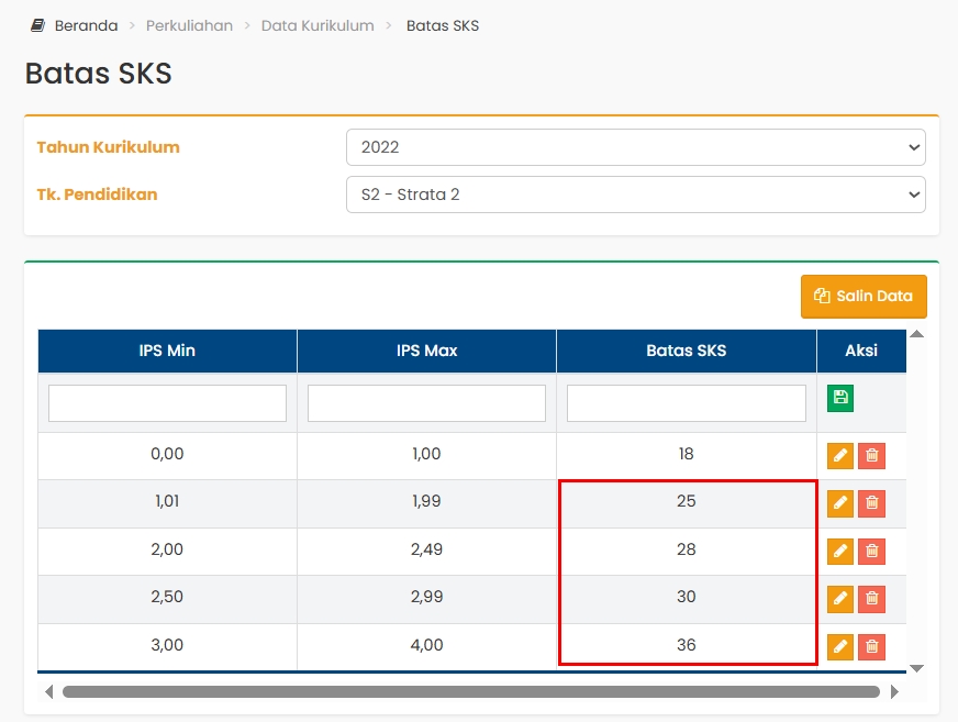 Menu : Perkuliahan > Data Kurikulum > Batas SKS