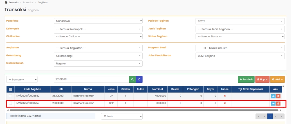 2. Penyesuaian Generate Tagihan Mahasiswa Pindahan Alih Bentuk Sesuai Tarif Tagihan Per Semester