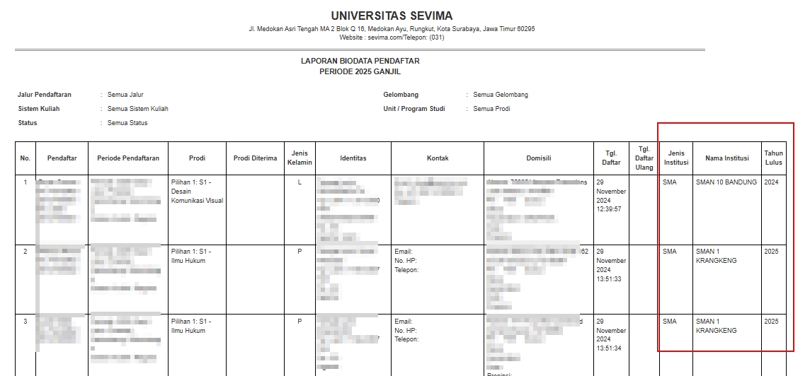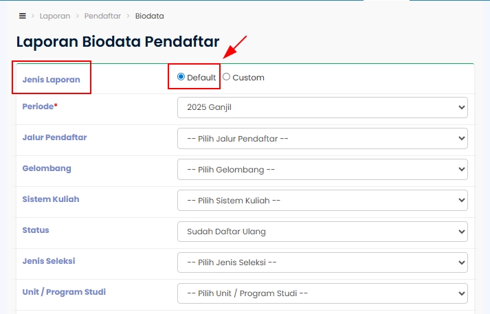 Admin PMB dapat cetak Laporan Biodata Pendaftar menggunakan template 'Default' berdasarkan template yang disediakan oleh sistem