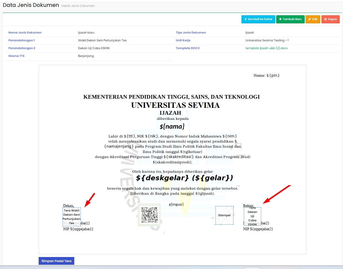 Pada detail jenis dokumen, Admin dapat mengatur letak tanda tangan digital
