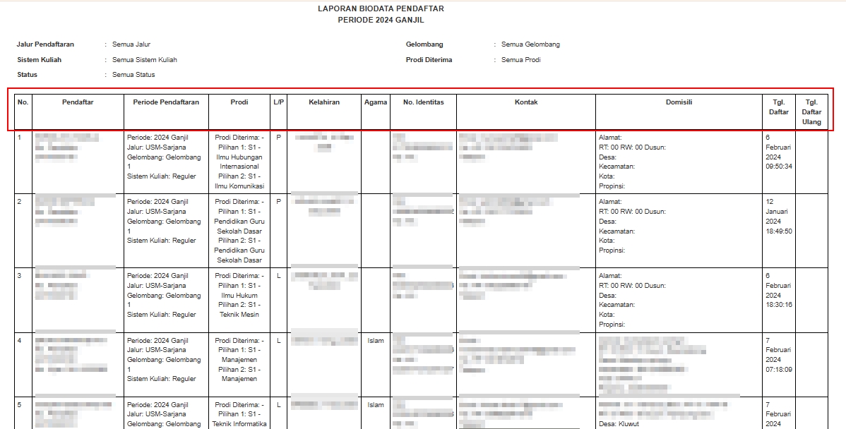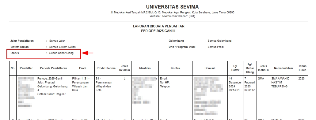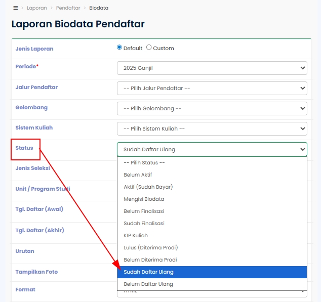 Admin PMB dapat menampilkan data Pendaftar berdasarkan status tahapan, seperti menampilkan data Pendaftar yang hanya 'Sudah Daftar Ulang' menggunakan filter 'Status' pada Laporan Biodata Pendaftar.