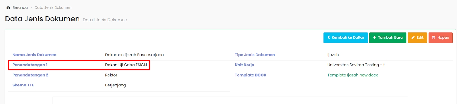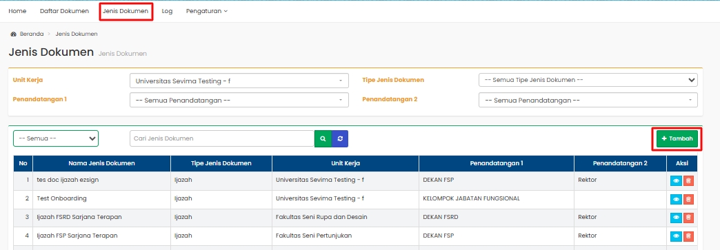 Admin menambahkan jenis dokumen seperti Ijazah dan Transkip yang akan diproses untuk Tanda Tangan Elektronik