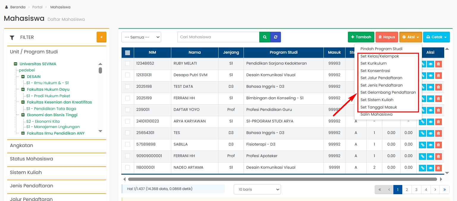 4. Admin Akademik dapat mengubah data mahasiswa secara kolektif dengan menggunakan fitur "Ubah Data Mahasiswa" melalui halaman Daftar Mahasiswa.