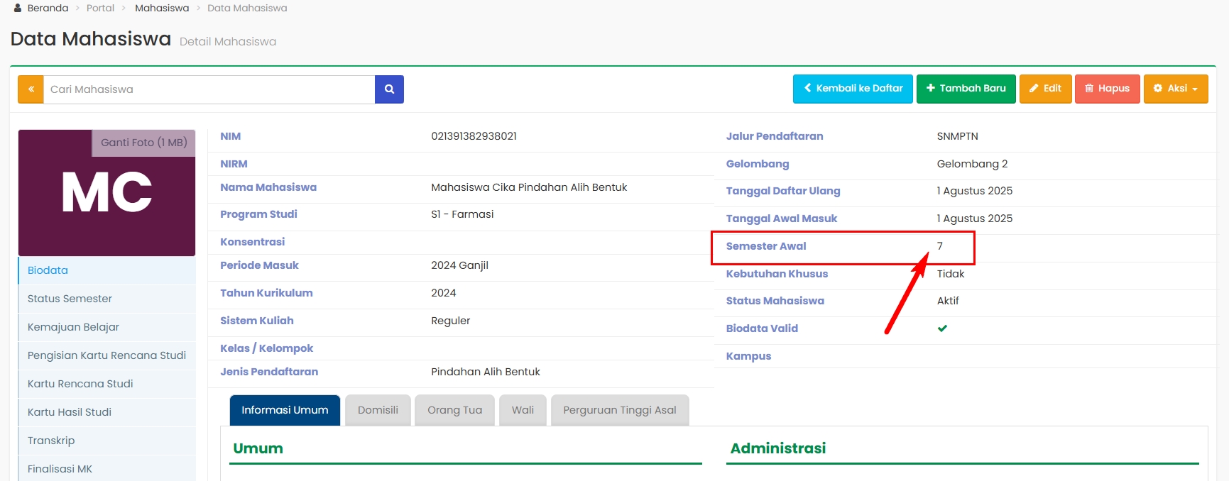 1. Admin Akademik dapat melihat semester awal mahasiswa pindahan alih bentuk dengan benar pada Detail Mahasiswa.