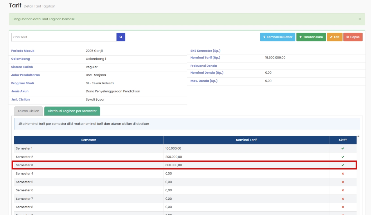 Admin Keuangan melakukan pengaturan nominal tagihan tiap semester pada halaman Distribusi Tagihan per Semester.