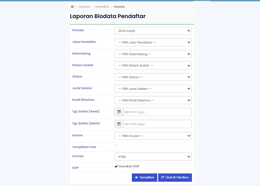 Menu : Laporan > Pendaftar > Biodata