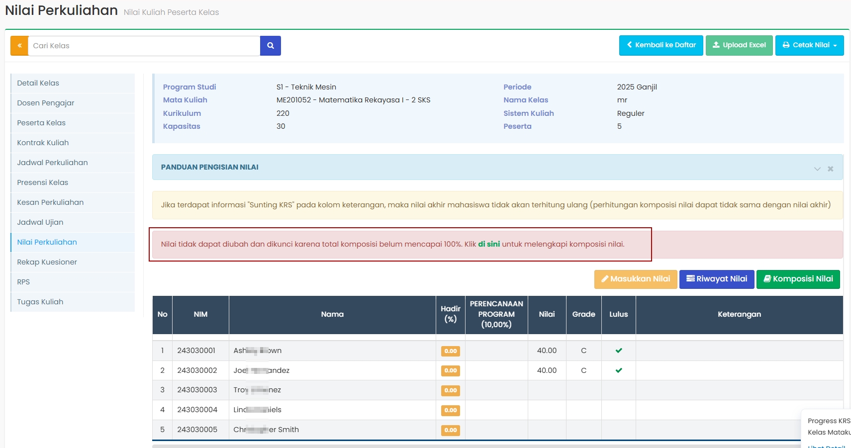 Sistem membatasi pengisian/ubah nilai, kunci nilai, hitung ulang nilai, dan umumkan nilai ketika total komposisi nilai belum mencapai 100%, sehingga menjamin perhitungan nilai akhir lebih akurat dan sesuai dengan bobot penilaian.