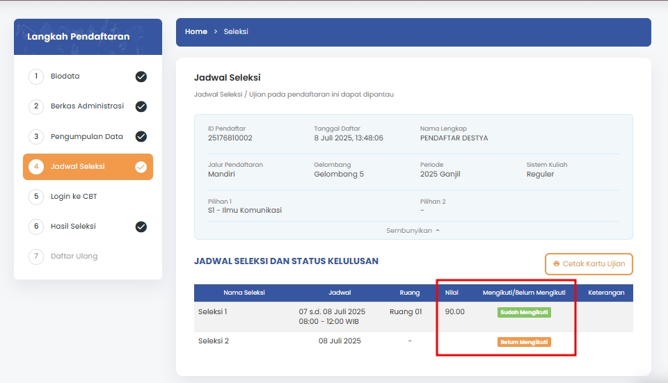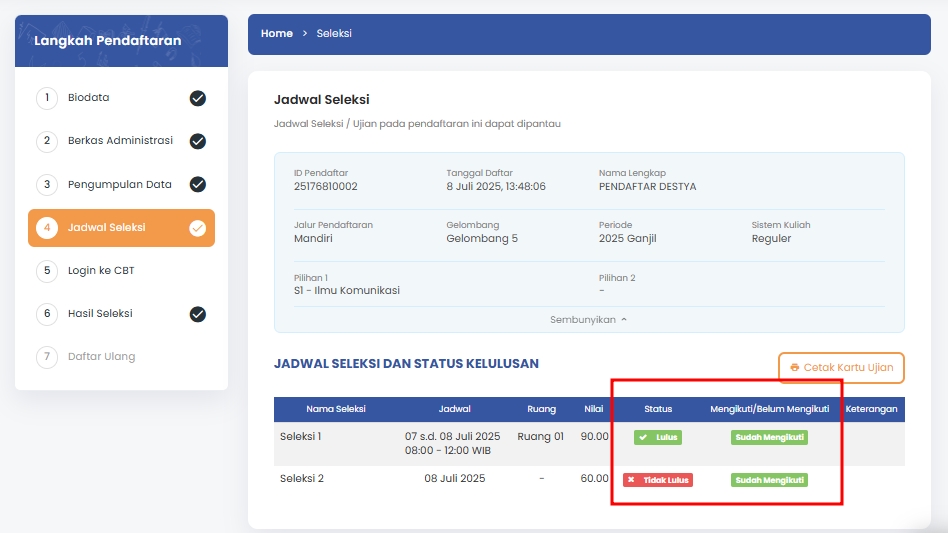 Halaman 'Jadwal Seleksi' akan menampilkan lulus tidaknya Pendaftar dalam proses seleksi, juga informasi apakah Pendaftar belum / sudah mengikuti Seleksi