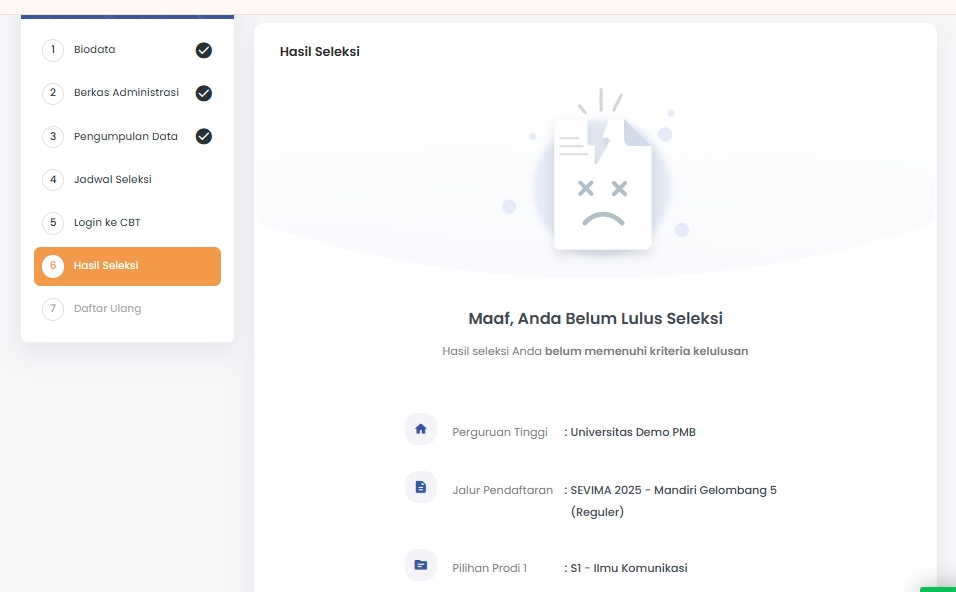 Apabila Pendaftar tidak lolos di salah satu tahap seleksi, maka Pendaftar akan otomatis dianggap gugur dan tidak lolos Prodi tujuan.