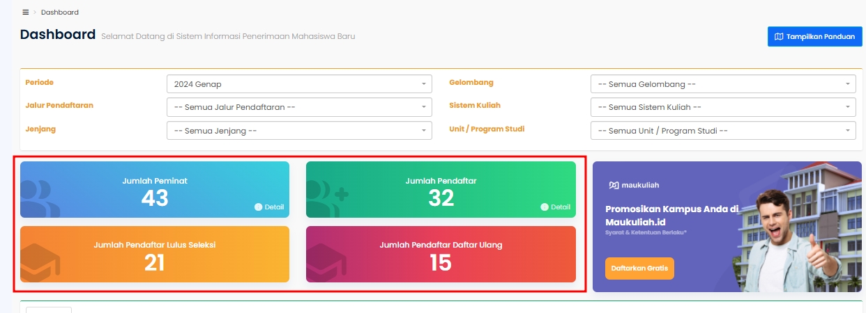 Admin PMB Dapat Memantau Jumlah Pendaftar di Setiap Tahapan Periode Pendaftaran melalui Dashboard PMB