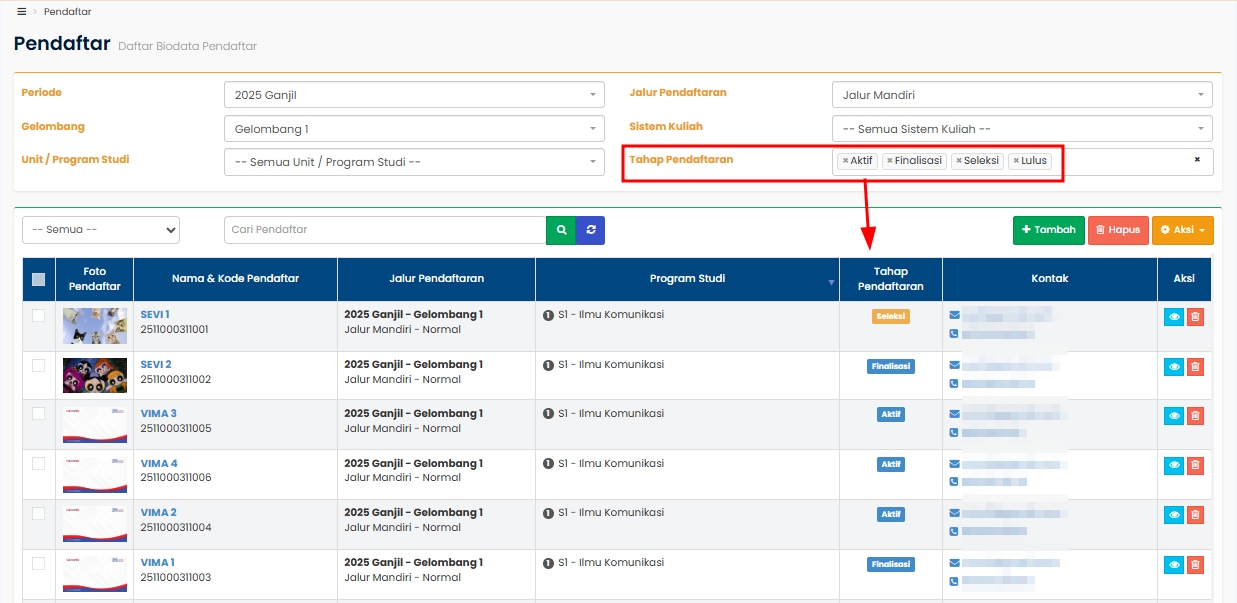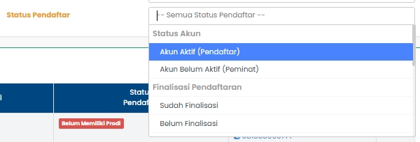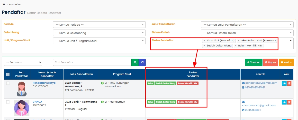Filter Kombinasi Status Pendaftaran pada Menu Pendaftar