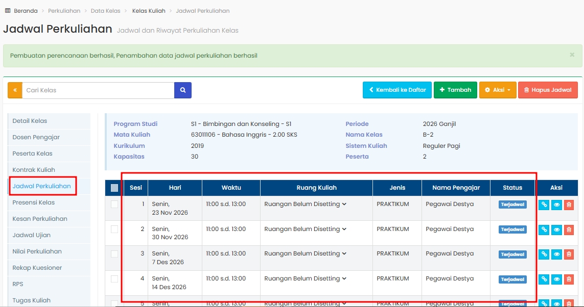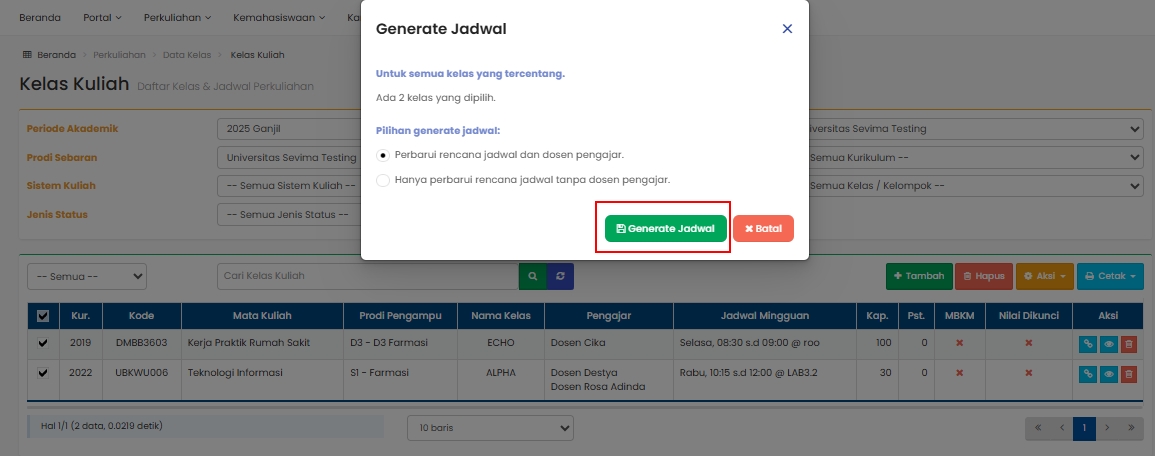 Jika disimpan, maka Jadwal Perkuliahan akan ikut serta ter-generate secara otomatis.