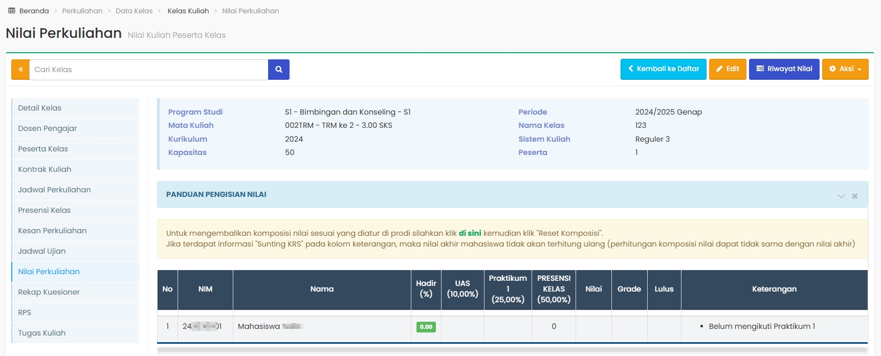 Menu : Perkuliahan > Data Kelas > Kelas Kuliah > Nilai Perkuliahan