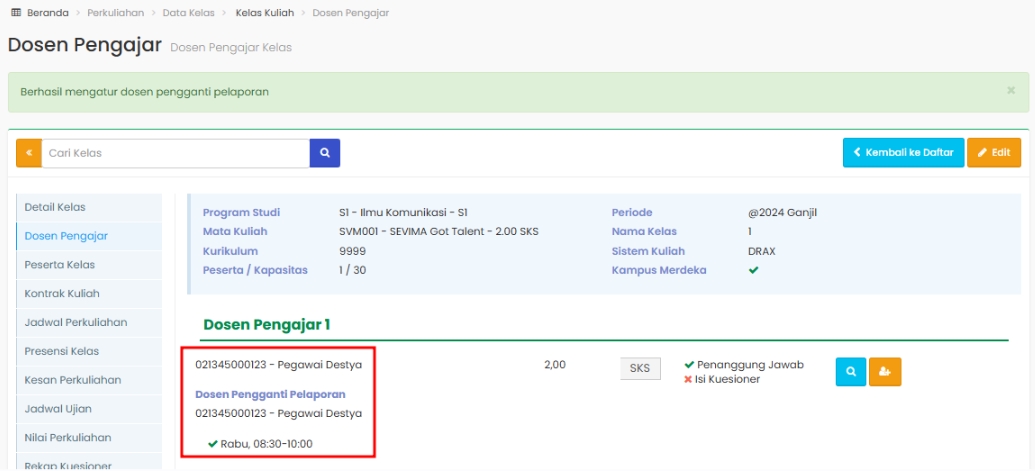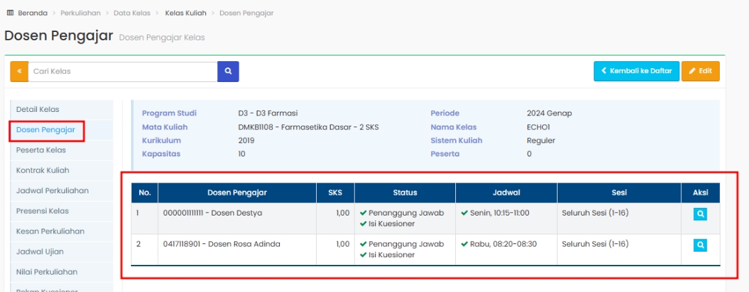 Menu : Perkuliahan > Data Kelas > Kelas Kuliah > Dosen Pengajar