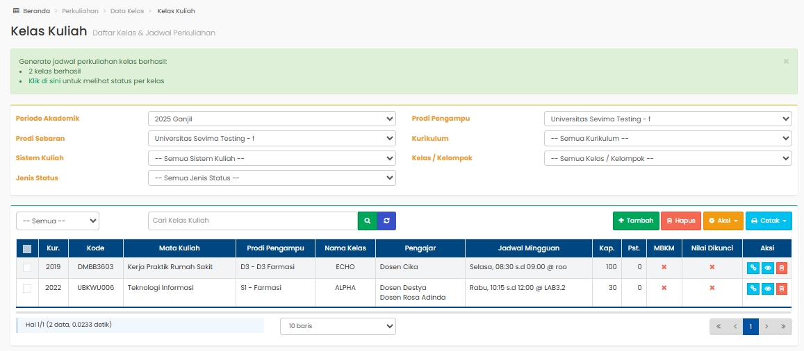 Admin harus generate Jadwal Perkuliahan (secara manual) satu per-satu pada detail Kelas Perkuliahan.