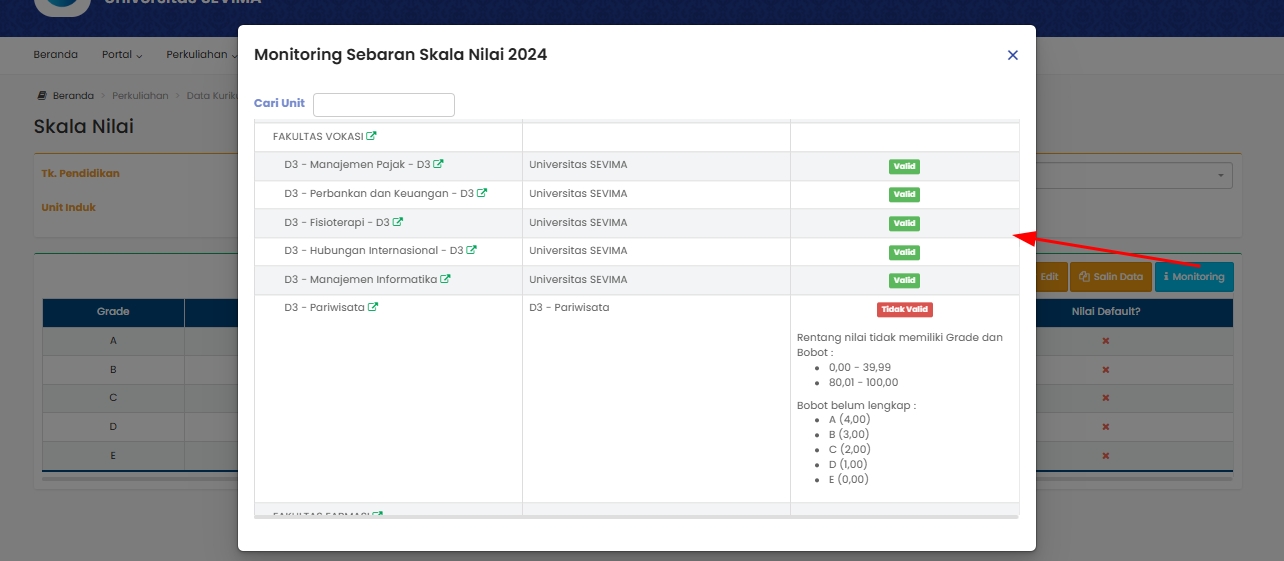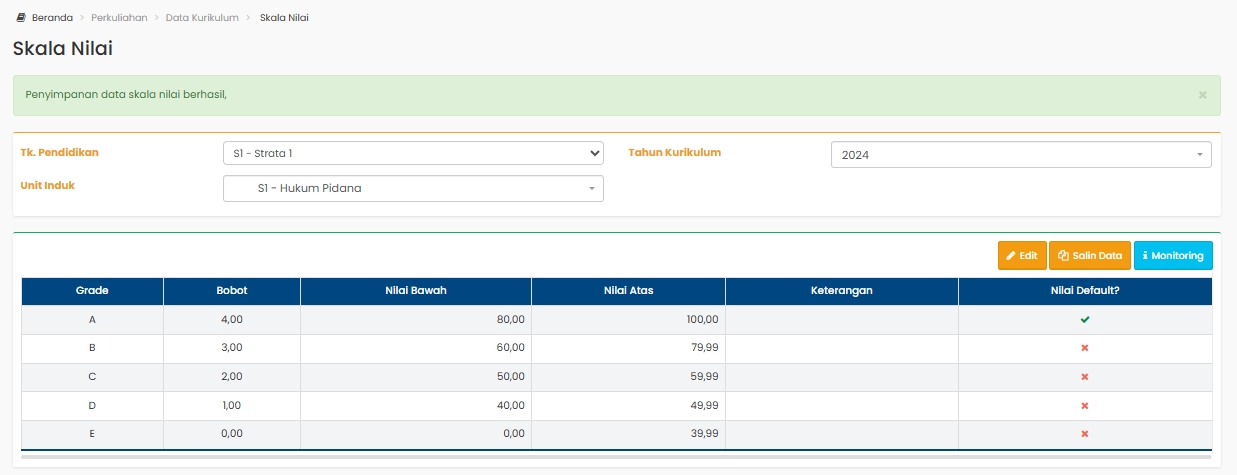 Menu : Perkuliahan > Data Kurikulum > Skala Nilai > Klik Tombol Monitoring