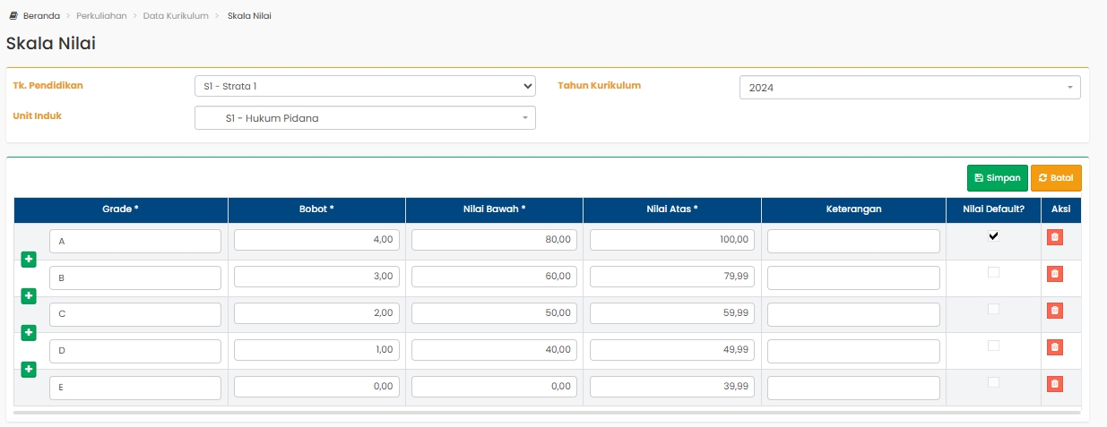 Menu : Perkuliahan > Data Kurikulum > Skala Nilai
